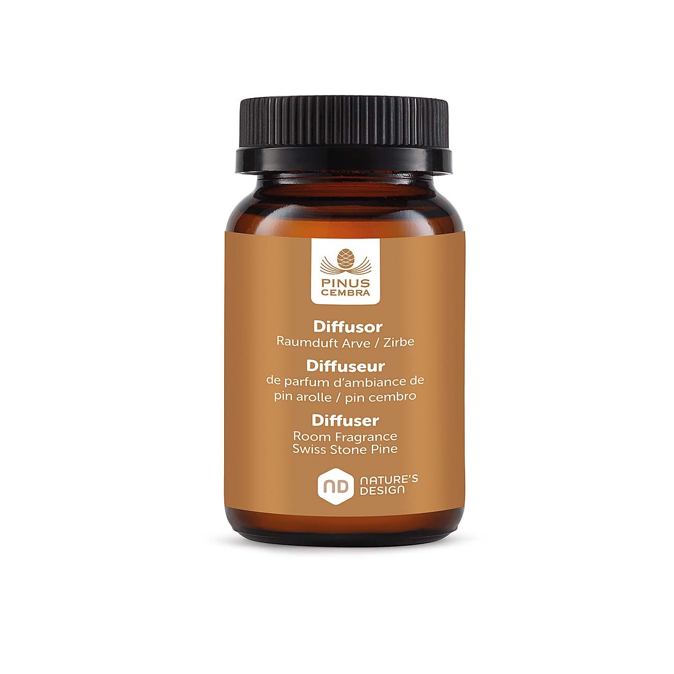 Diffusor Nachfüllung Pinus Cembra: die Duftmischung aus ätherischem Zirbenöl ist von sehr hoher Qualität und reicht für ca. 2 Monate, um einen angenehm aromatischen Raumduft zu verbreiten. Die Rattanstäbchen werden einfach in die Flasche gestellt und diese in den Zirbenholz Diffusor.